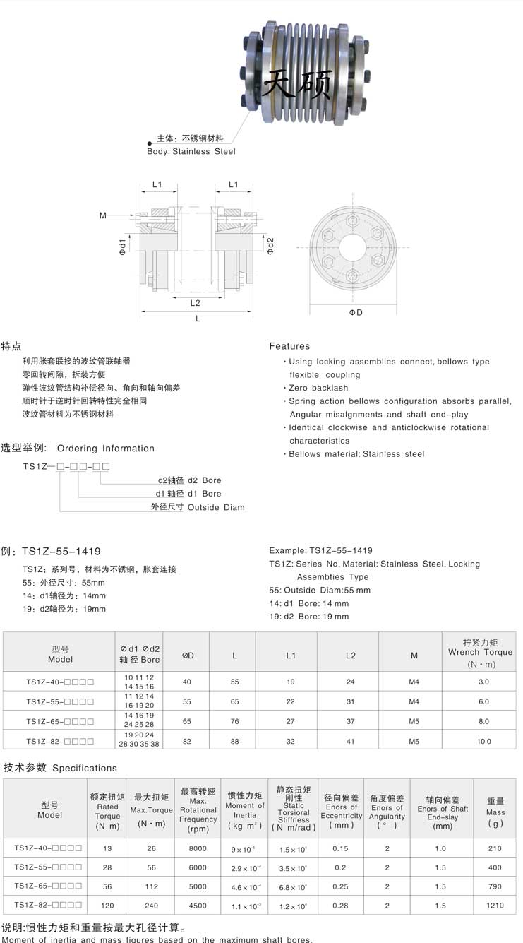 TS1Z脹套波紋管聯(lián)軸器,精密聯(lián)軸器,天碩聯(lián)軸器官網(wǎng),波紋管聯(lián)軸器采用高柔性不銹鋼,具有高扭矩剛性,軸向、徑向和角度錯(cuò)位在平穩(wěn)均勻中得到補(bǔ)償,使用脹緊方式,安裝空間小,裝卸方